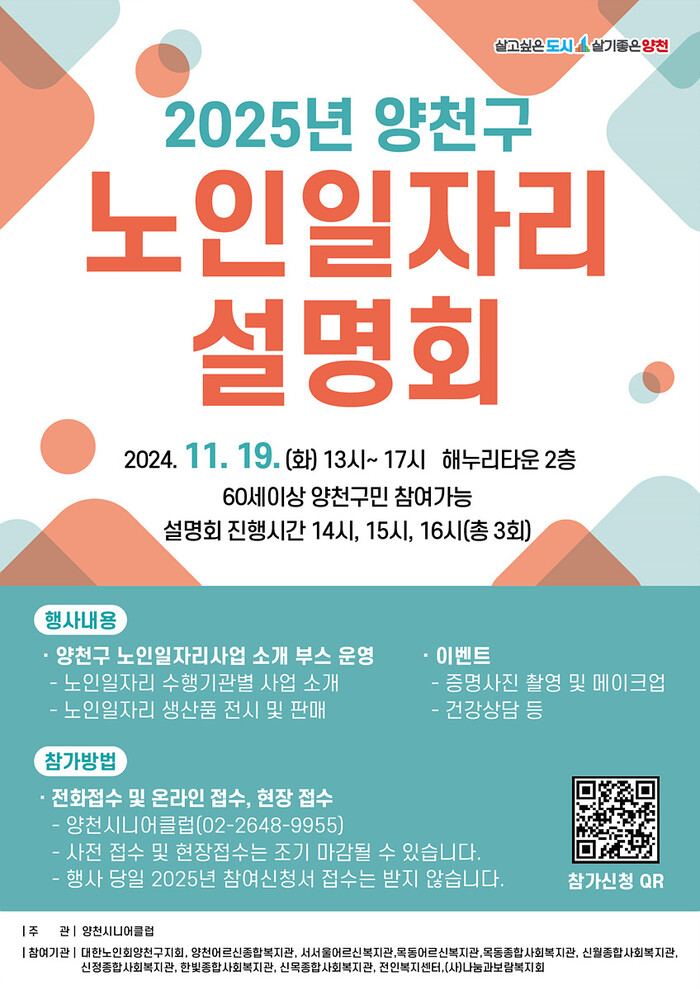 노인일자리 발전과 지역 노인들의 건강하고 활기찬 노후생활을 목표로 열리는 본 행사는 양천시니어클럽이 주관하고 지역내 노인일자리사업 수행기관 11곳가 공동으로 참여한다.