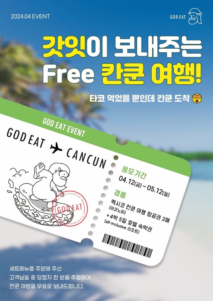 ㈜더갓의 멕시칸 프랜차이즈 브랜드 갓잇이 카리브해를 접한 에메랄드빛 해변 휴양지로 유명한 멕시코 칸쿤을 보내주는 1천만 원 상당의 역대급 프로모션을 진행한다고 밝혔다.