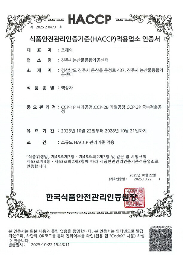 진주시 농산물종합가공센터는 지역농산물을 활용해 가공제품 개발과 농업인의 소득창출을 돕고 있으며, 지난해 7월 과채주스류와 캔디류 2개 유형에 대해 ‘HACCP’ 인증을 받은 후, 올해 10월 22일 잼류와 액상차 2개 유형을 추가로 인증받아 농산물종합가공센터에서 생산되는 제품의 안전성과 신뢰도를 한층 더 높였다.
