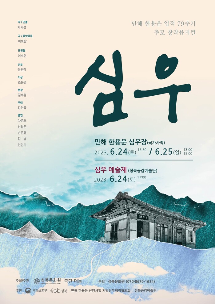 [시민일보 = 홍덕표 기자] 서울 성북구(구청장 이승로) 성북문화원의 극단 더늠이 독립운동가 만해 한용운 선생의 삶과 정신을 다룬 창작 뮤지컬 ‘심우’를 개최한다.