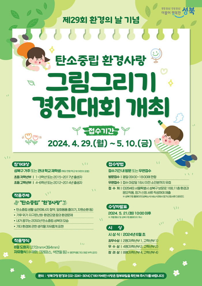 [시민일보 = 여영준 기자] 성북구(구청장 이승로)가 제29회 환경의 날(6월5일)을 기념해 '탄소중립 환경사랑 그림그리기 경진대회'를 개최한다.