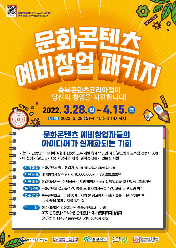 청주시가 주관하고 청주시문화산업진흥재단(대표이사 박상언)이 운영하는 충북콘텐츠코리아랩이 오는 4월 15일(금)까지 ‘문화콘텐츠 예비창업 패키지’에 참여할 예비창업자를 모집한다고 밝혔다.