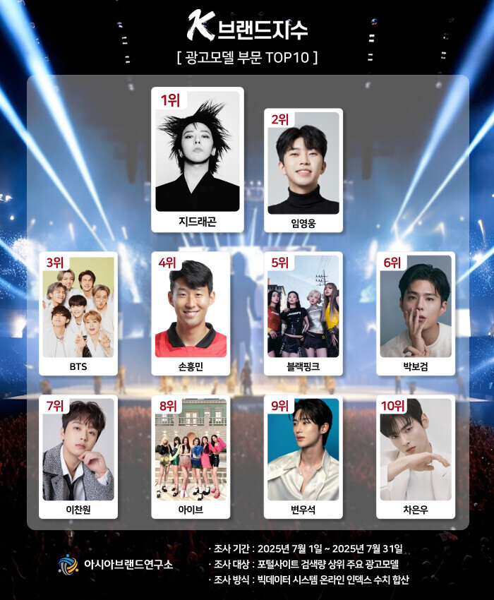 K-브랜드지수 광고모델 부문은 지드래곤이 1위에 등극했으며, 이어 임영웅(2위), 방탄소년단(3위), 손흥민(4위), 블랙핑크(5위), 박보검(6위), 이찬원(7위), 아이브(8위), 변우석(9위), 차은우(10위)가 TOP10의 영예를 안았다.