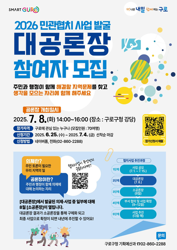 [시민일보 = 박소진 기자] 구로구(구청장 장인홍)가 2026 민관협치사업 발굴 대공론장 참여자를 모집한다.