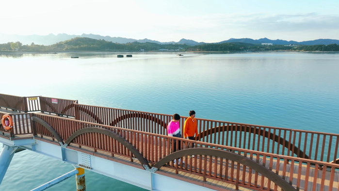 | ▲ 강최수종 배우와 도경완 방송인이 육지와 연결된 가우도 연도교를 걷고 있다. / 사진=강진군 제공 |