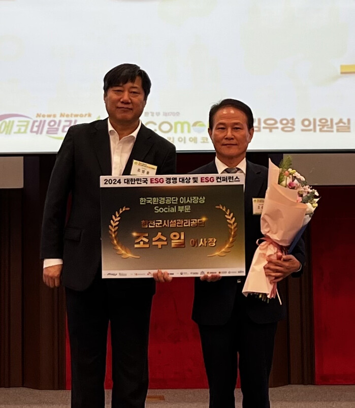 [합천=이영수 기자] 합천군시설관리공단(이사장 조수일)이 지난 11월29일 서울 국회박물관에서 열린 ‘2024 대한민국 ESG 경영대상’ 시상식에서 한국환경공단 이사장상을 수상했다고 밝혔다.