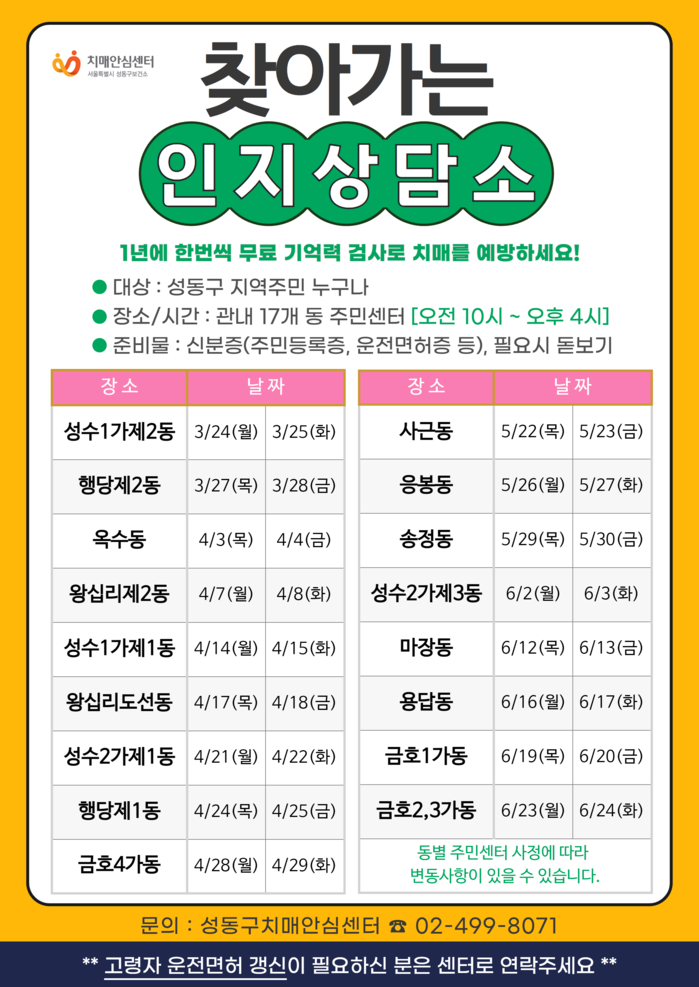 자세한 동별 순회검진 일정 및 치매 관련 상담과 문의는 성동구치매안심센터로 하면 된다.