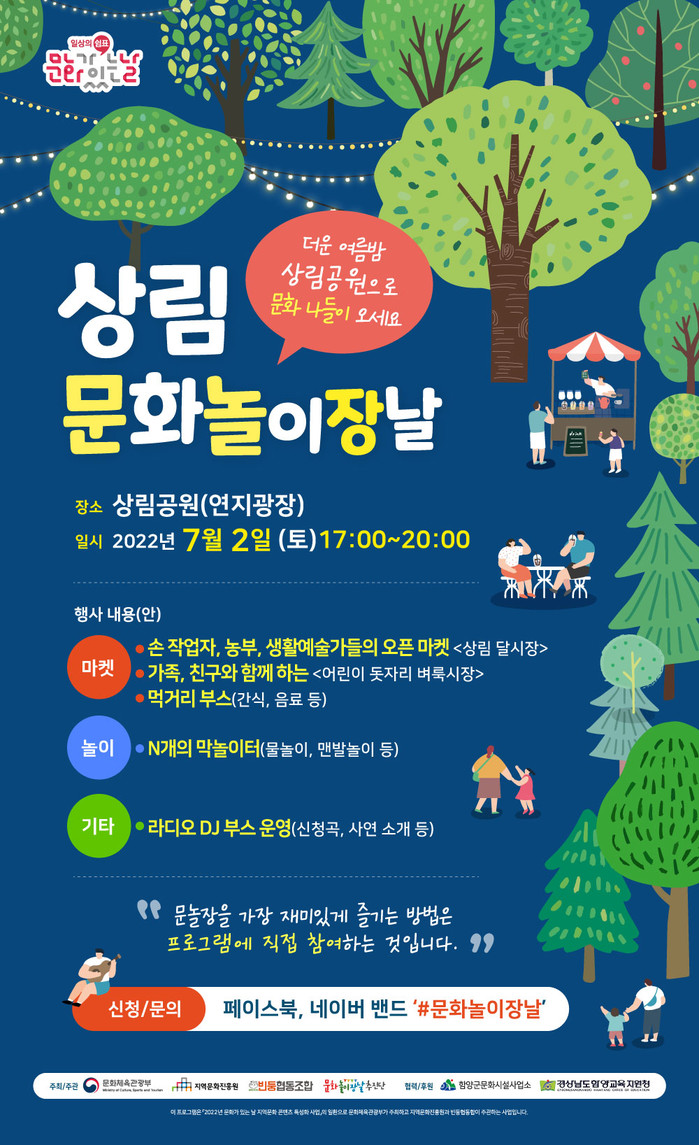 이번 상림 문화놀이장날은 더운 낮 시간을 피해 오후 5시부터 저녁 8시까지 개최되며 마켓, 놀이, 라디오DJ 부스를 운영하며, 마켓은 손 작업자·농부·생활 예술가들의 오픈 마켓인 상림 달 시장과 가족·친구와 함께하는 어린이 돗자리 벼룩시장, 그리고 간단한 먹거리 부스로 운영된다.