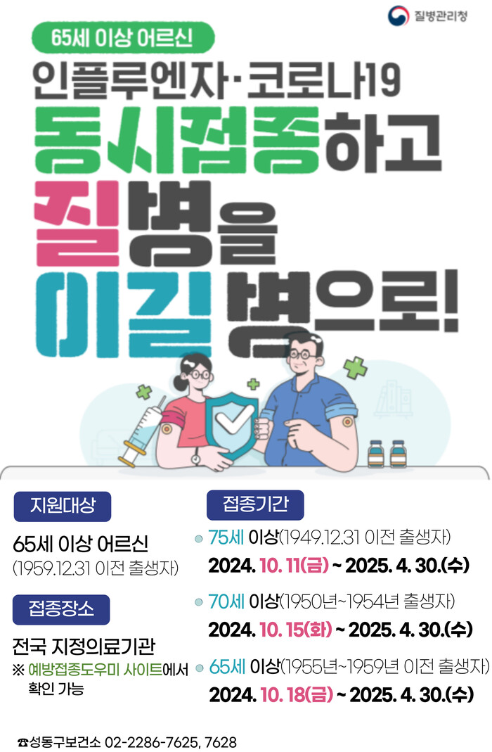 [시민일보 = 박소진 기자] 서울 성동구(구청장 정원오)는 오는 11일부터 내년 4월30일까지, 65세 이상 노인 대상으로 인플루엔자(독감) 및 코로나 19 예방접종을 실시한다.