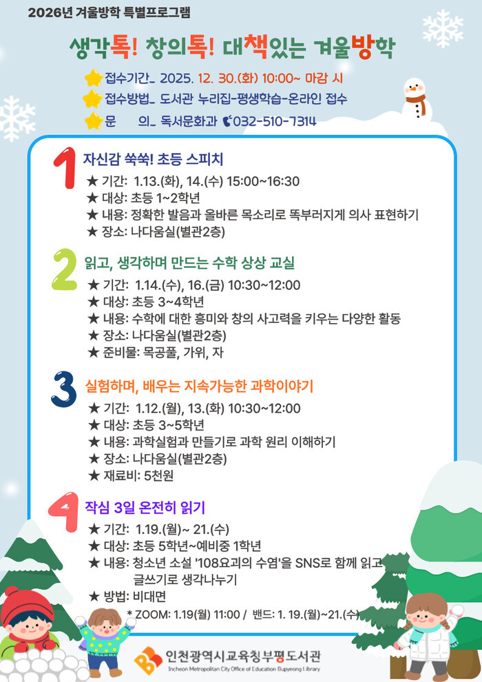 [인천=문찬식 기자] 인천광역시교육청부평도서관(관장 김재영)은 겨울방학을 맞아 1월 한달간 새 학년을 준비하는 초등학생과 중학생을 대상으로 겨울방학 특별프로그램을 운영한다.