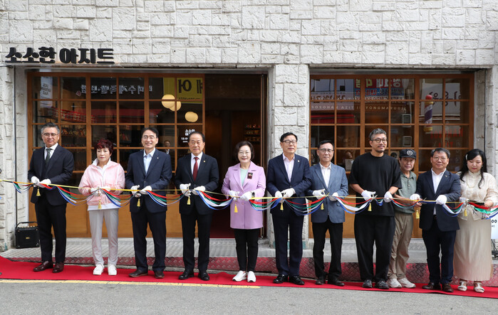 | ▲ 소소한 아지트 오픈식에 참석한 박희영 구청장(왼쪽 다섯 번째)이 관계자들과 테이프 커팅을 하고 있다. |