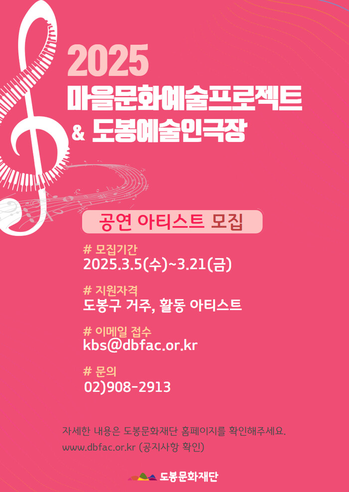 [시민일보 = 문민호 기자] 도봉구(구청장 오언석) 도봉문화재단이 오는 21일까지 ‘2025 마을문화예술프로젝트‧도봉예술인극장’ 참여 예술가를 모집한다.