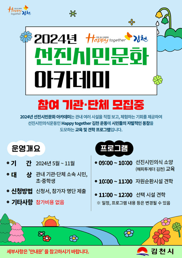 [김천=박병상 기자] 견북 김천시에서 운영하는 ‘2024년 Happy together 김천 선진 시민문화 아카데미’에 대한 관내 기관, 단체, 학교의 관심이 높아지며, 관련 문의가 쇄도하고 있다.