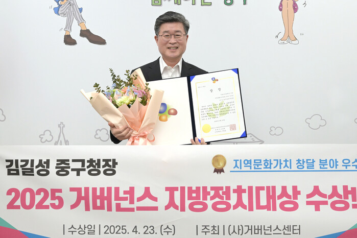 [시민일보 = 여영준 기자] 김길성 서울 중구청장이 지난 23일, ‘2025 거버넌스지방정치대상’지역 문화가치 창달 분야에서 우수상을 수상했다. 지난해 ‘사회경제 활력증진’ 분야 수상에 이어 2년 연속 수상의 영예를 안았다.