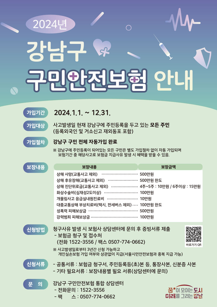 [시민일보 = 이대우 기자] 서울 강남구(구청장 조성명)가 구민들이 일상적 사고에서도 실질적인 보상을 받을 수 있도록 올해부터 구민안전보험의 보장항목을 포괄적 상해 중심으로 대폭 개선했다.