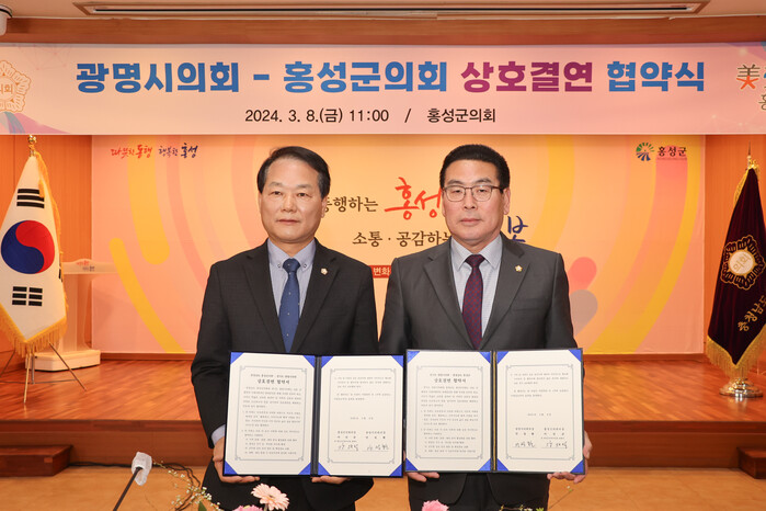 또한 장재석 홍성군의회 부의장은 “우리 홍성군과 광명시는 협약식을 하기 전부터 만남을 가지며, 지속적인 소통으로 일회성적이고 보여주기식 협약을 지양했다. 여러 지자체가 상호결연 협약식을 했지만 홍성군의회와 광명시의회의 협약이 우리끼리의 협약에서 끝나는 것이 아닌 우수사례가 되도록 노력하겠다”고 전했다.