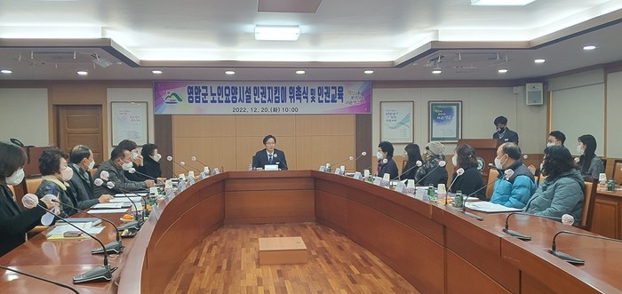 | ▲ 우승희 영암군수가 지난 20일 영암군청 낭산실에서 관내 노인요양시설 입소자 학대 예방을 위한 인권지킴이 위촉식 및 인권교육을 주재하고 있다. / 사진=영암군 제공 |