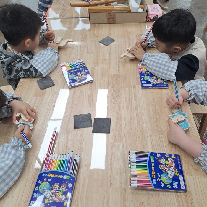 | ▲ 어린이들이 천왕산 목공체험장에서 만든 작품에 색칠을 하고 있다. (사진=구로구청 제공) |