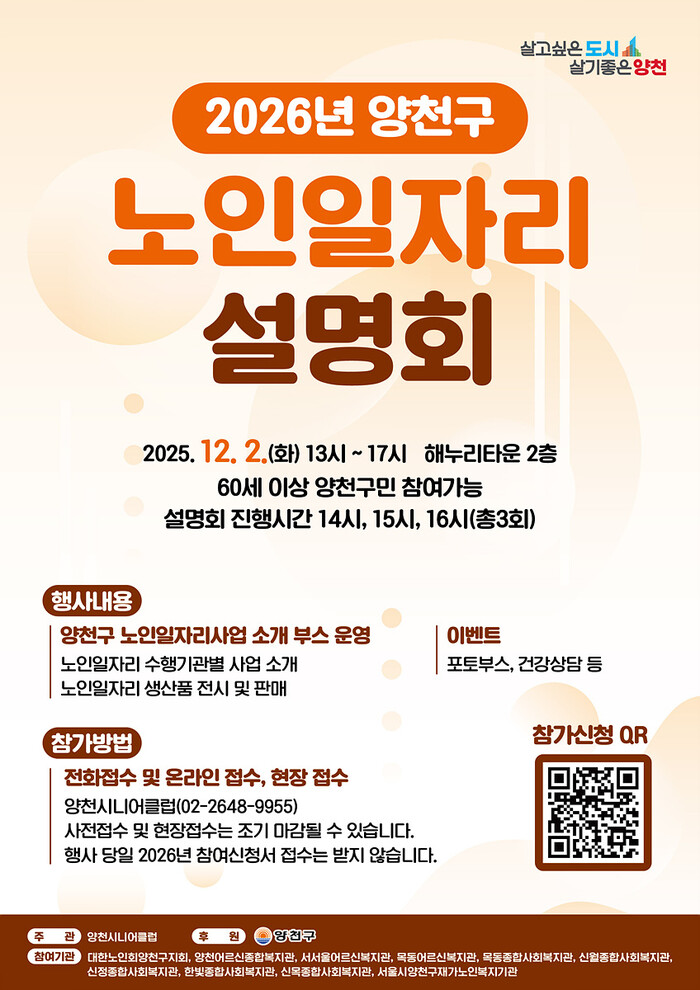 행사 참여를 원하는 노인은 이달 21일까지 양천시니어클럽 또는 QR코드를 통해 사전 신청할 수 있으며, 행사 당일 현장 접수도 가능하다.