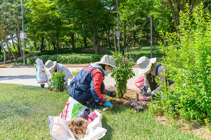 | ▲ 양천구 정원 자원봉사자 ‘정원친구’들이 가드닝활동을 하는 모습. (사진=양천구청 제공) |