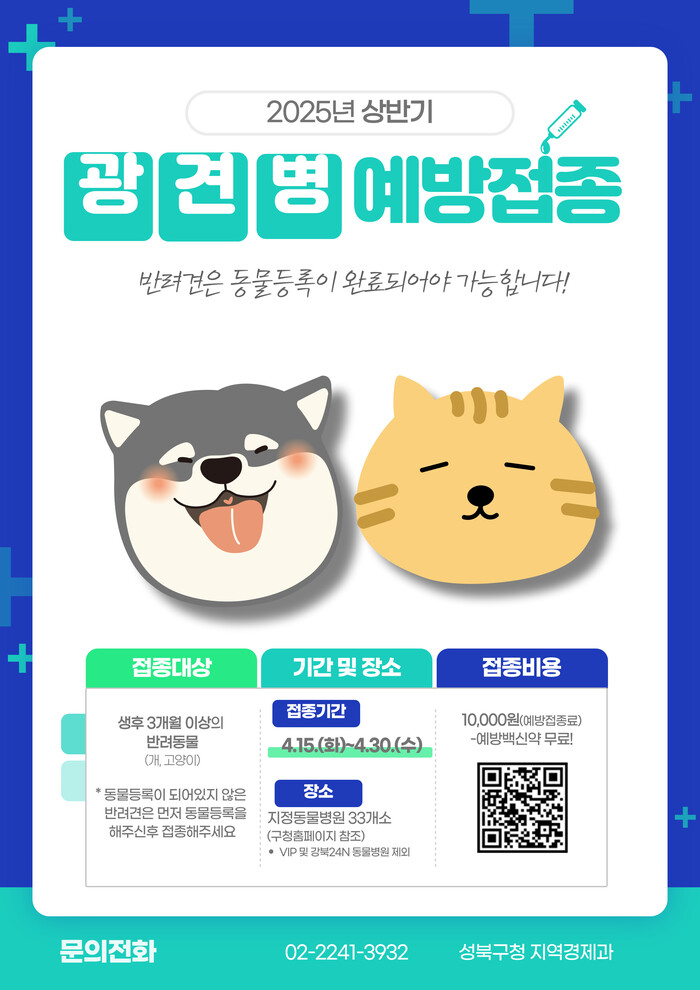 접종은 관내 동물병원 33곳에서 가능하며, 자세한 사항은 성북구 지역경제과로 문의하거나, 성북구청 누리집의 구정안내 새소식에서 확인할 수 있다.