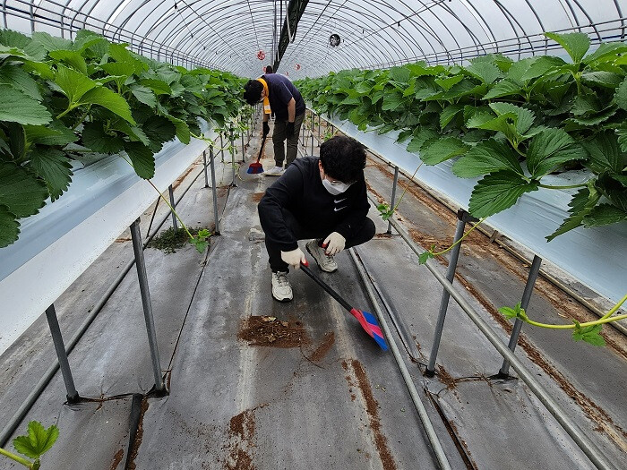 특히 이번 봉사활동은 도내 관계 기관과 상생하는 의미를 담고자 경남교육청 직원 30여 명과 경남농협, ㈜무학 임직원 40여 명 등 70여 명이 동참해 딸기 농장의 하우스 상토 교체 및 내부 정리 등에 힘을 보탰다.