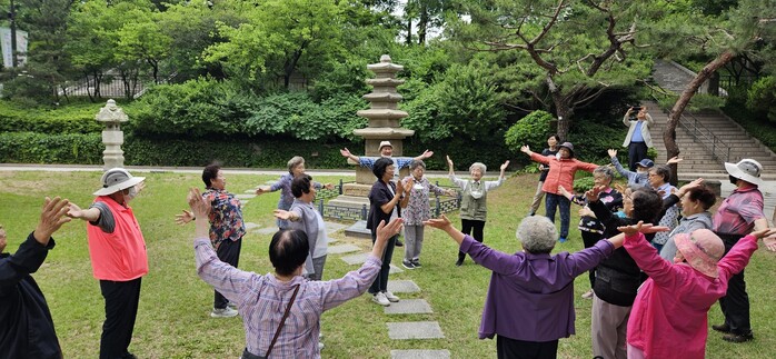 | ▲ 건강이랑서비스 일환으로 기획된 ‘숲 치유 프로그램’ 참여 주민들의 모습(경희궁공원) (사진=종로구청 제공) |