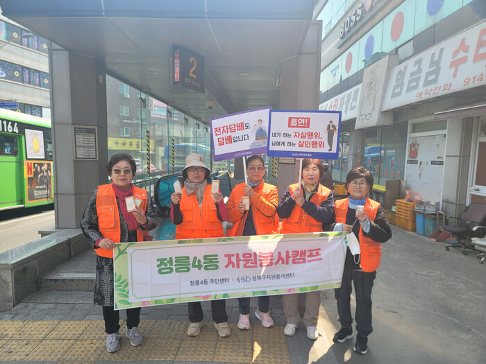 [시민일보 = 문민호 기자] 성북구(구청장 이승로) 정릉4동 자원봉사캠프(캠프장 이문희)가 지난 1일 북한산보국문역 앞에서 간접흡연 없는 살고 싶은 도시를 만들기 위한 금연 캠페인을 실시했다.