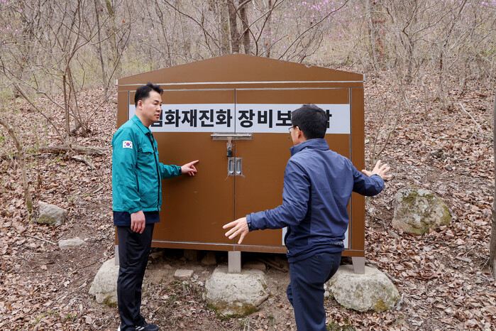| ▲ 오언석 구청장(왼쪽)이 도봉산 내 화재진화 장비 보관함 운용 상태를 확인하고 있다. (사진=도봉구청 제공) |