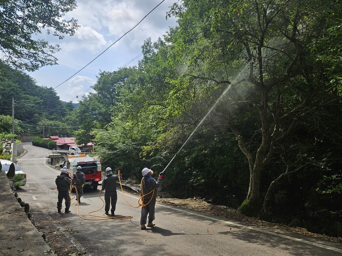 이번 협업 방제에서는 미국선녀벌레, 갈색날개매미충, 꽃매미 등의 돌발해충을 대상으로 다목적 방제차 및 산림병해충 예찰방제단을 동원해 임도, 산림 연접지와 산림지역에 지상 방제를 했다.