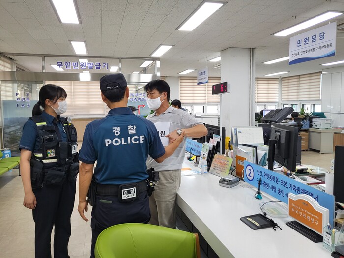 이날 훈련에서는 민원응대 매뉴얼에 따라 민원인 폭언 및 폭행 발생 시 △상급자의 적극적인 개입 △사전고지 후 녹음 △112상황실 비상벨 호출 △피해공무원 보호 △출동 경찰의 민원인 제지 및 인계 등으로 이뤄졌다.