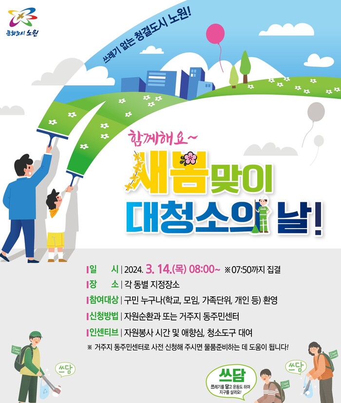 [시민일보 = 이대우 기자] 노원구(구청장 오승록)가 ‘깨끗한 우리동네, 노원의 얼굴입니다!’라는 슬로건과 함께 2000여명이 참여하는 ‘새봄맞이 대청소의 날’을 운영한다.