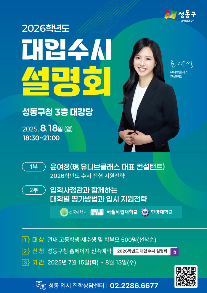 [시민일보 = 박소진 기자] 성동구(구청장 정원오)는 오는 18일 성동구청 3층 대강당에서 ‘2026학년도 대입 수시 지원전략 설명회’를 개최한다고 밝혔다.