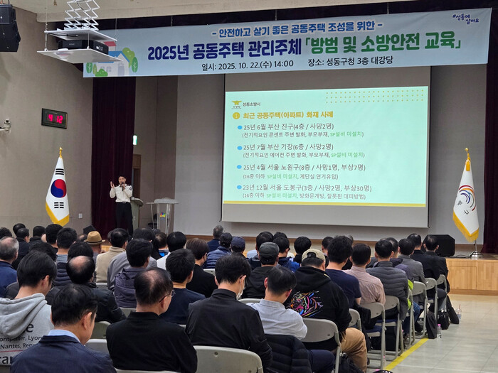 [시민일보 = 박소진 기자] 성동구(구청장 정원오)는 지난 22일 공동주택 안전관리의 전문성을 높이고 실효성 있는 안전 대응 체계를 구축하기 위해 공동주택 관리주체를 대상으로 방범 및 소방안전교육을 실시했다.