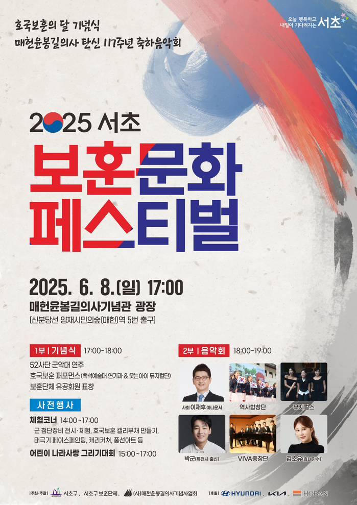 [시민일보 = 박소진 기자] 서초구(구청장 전성수)가 6월 호국보훈의 달을 맞아 국가를 위해 헌신한 호국영령을 기리고 국가보훈 대상자를 예우하기 위해 오는 8일 매헌윤봉길의사기념관 광장에서 ‘2025 서초 보훈문화 페스티벌’을 개최한다고 밝혔다.
