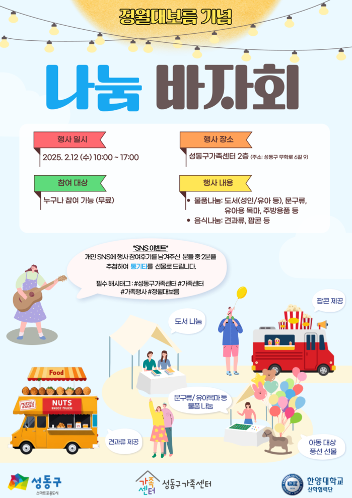 [시민일보 = 박소진 기자] 성동구(구청장 정원오)는 지난 12일 성동구가족센터 주관으로 정월대보름을 맞이하여 ‘나눔바자회’를 개최하였다고 밝혔다.