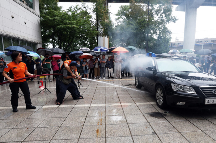 서울 노원구가 최근 구청에서 공동주택 ‘전기차 화재 위험 초기 대응 훈련’을 진행했다. 이날 훈련에는 안전관리책임자 및 희망 주민 등 300여명이 참여했다. 사진은 구청 주차장에서 ‘전기차 화재 위험 대응 교육’ 참가자들과 화재진압 실습을 진행하는 모습. (사진=노원구청 제공)