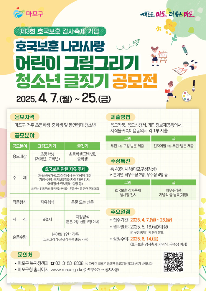 [시민일보 = 문민호 기자] 마포구(구청장 박강수)는 ‘제3회 호국보훈 감사축제’를 맞아 ‘호국보훈·나라사랑 어린이 그림그리기·청소년 글짓기 공모전’을 개최한다고 11일 밝혔다.