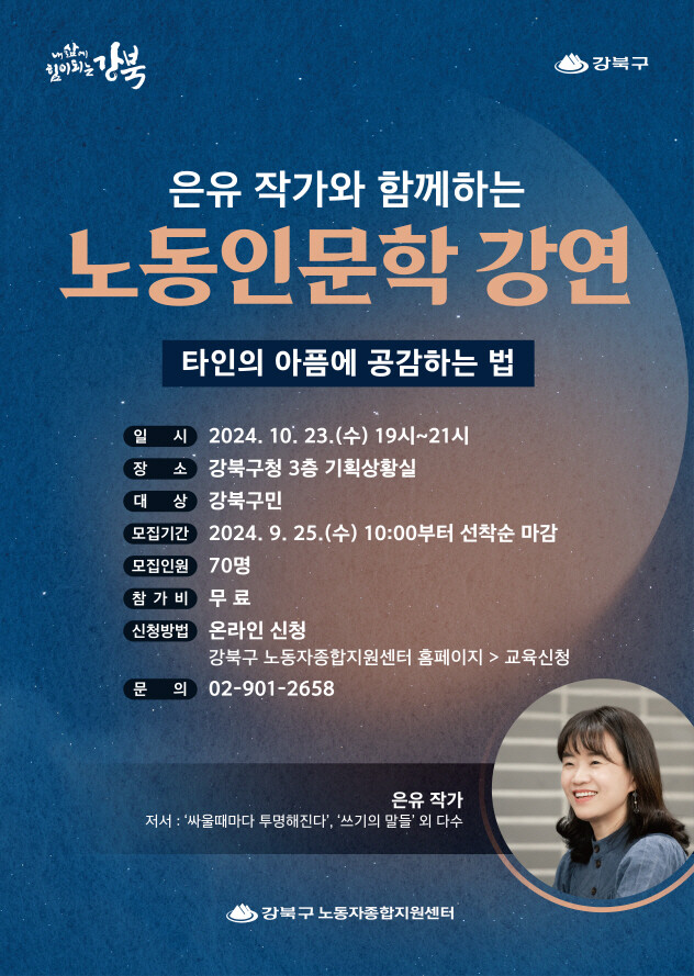이순희 구청장은 “우리 사회의 다양한 노동인권 문제들에 대해 고민하며 타인의 아픔에 공감하고 연대하기 위해 끊임없이 노력하는 은유 작가님을 초청하게 되어 뜻깊게 생각한다”라며 “이번 강연이 강북구민들에게 따뜻한 위로와 공감의 시간이 되기를 바란다”고 말했다.