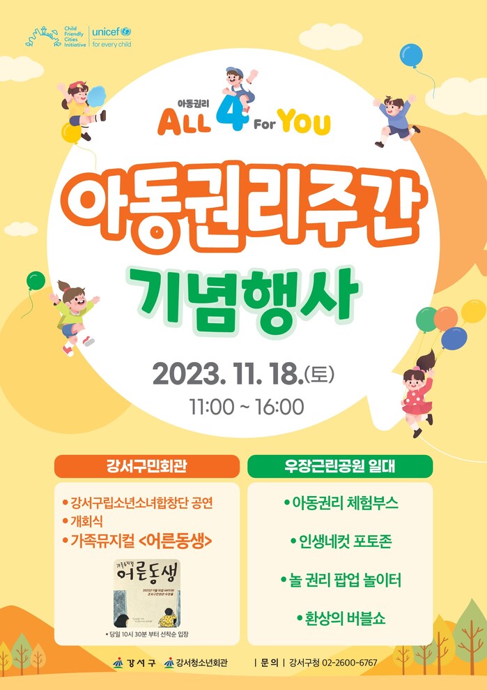 아울러 행사기간 내내 2023년 아동권리 그림 전시회가 열려 지난해 아동권리 포스터 공모전 수상작을 게시한다. 18일에는 강서구민회관 우장갤러리에서, 19~24일은 발산역 2번출구 지하보도에서 진행된다.