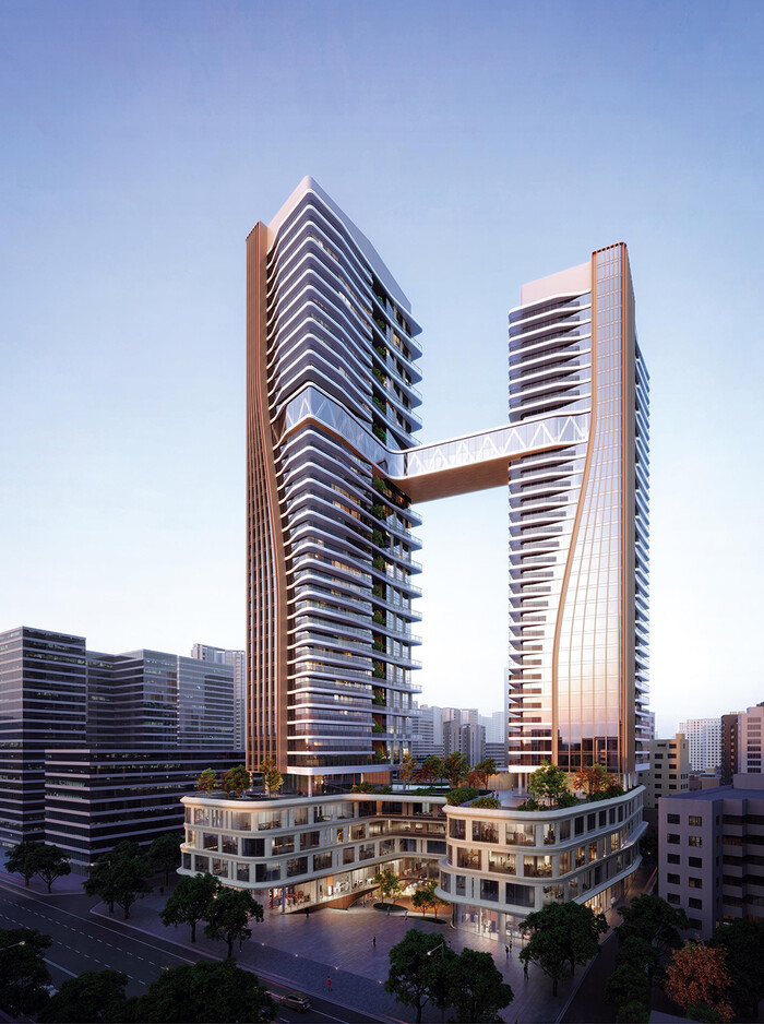 두 개 건물 사이는 다리로 연결해 교육 시설 중심으로 상업과 주거 및 공공시설이 유기적으로 연계될 수 있도록 건설한다.