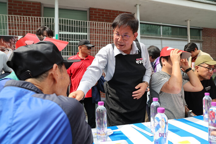 | ▲ 박강수 마포구청장이 행복짜장Day 행사에서 주민들과 인사를 나누고 있다. (사진=마포구청 제공) |