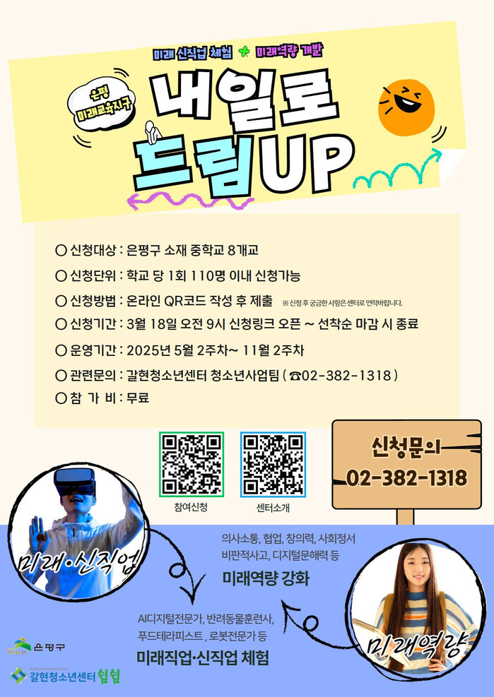 조정현 갈현청소년센터 관장은 “내일로 드림up을 통해 은평구 청소년들의 공간인 갈현청소년센터에서 핵심미래역량을 갖출 기회를 제공하고 올바른 진로 의식을 함양할 수 있기를 기대한다”고 말했다.
