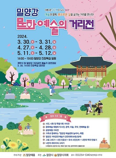 한편, 밀양강 문화예술 거리전은 올해 총 3번 개최된다. 1차는 3월 30일, 2차는 4월 27일, 3차는 5월 11일부터 시작해 각각 이틀간 이어지며, 행사 시간은 오후 2시부터 7시까지다. 행사 기간 중 진장 둑길 전기안전공사 밀양창녕지사에서 투썸플레이스 구간은 오후 1시부터 7시까지 차량 통행이 제한된다.