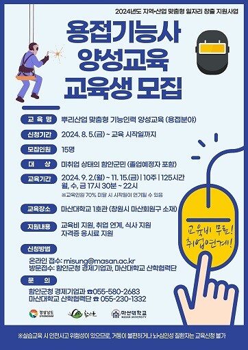 신청서는 함안군청 3층 경제기업과 일자리담당으로 8월 30일(금)까지 접수 가능하며, 기타 자세한 내용은 군 경제기업과 일자리담당 혹은 마산대학교 산학협력단 으로 문의하거나 함안군청 홈페이지 내 고시공고란을 참조하면 된다.