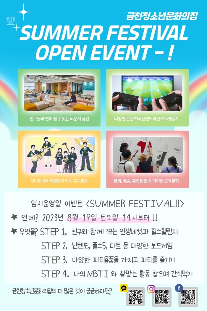 금천청소년문화의집에서는 임시 운영 개시일인 19일 오후 2시에 여름 축제를 주제로 ▲친구들과 함께 찍는 ‘인생네컷’ ▲닌텐도, 플레이스테이션, 보드게임 파티용품을 가지고 파티 즐기기 ▲나의 성격 유형 검사(MBTI)와 잘 맞는 활동 찾으며 간식 먹기 등을 무료로 진행한다.