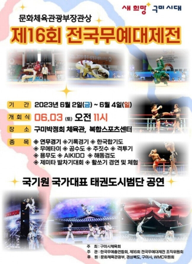 [구미=박병상 기자] 경북 구미시에서 한국무예총연합회 주관 제16회 전국무예대제전이 오는 6월2일부터 4일까지 박정희체육관에서 개최된다