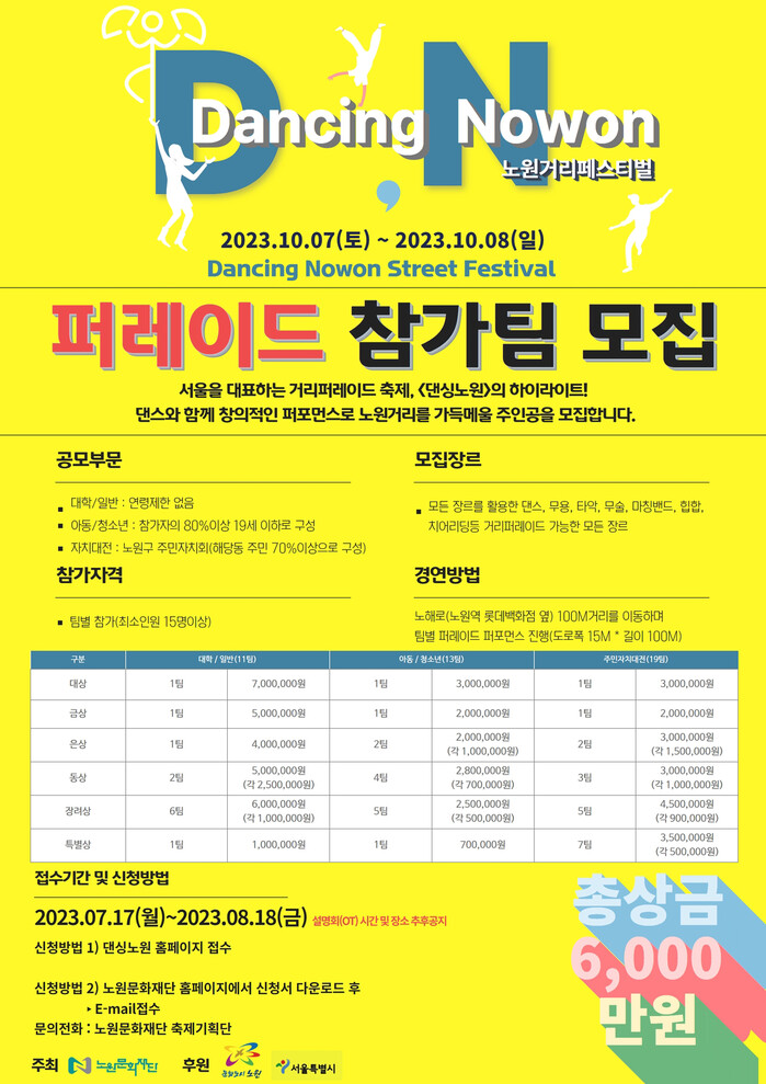 먼저 댄싱노원의 대표 프로그램인 '댄싱퍼레이드 경연'에 참가할 15명 이상으로 구성된 팀을 모집한다.