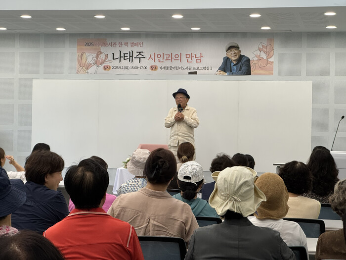 [인천=문찬식 기자] 인천광역시교육청서구도서관(관장 정연순)은 2일 지역주민을 대상으로 ‘서구도서관 한 책 캠페인’ 선정도서인 『버킷리스트』의 저자 나태주 시인을 초청해 저자 강연회를 개최했다.