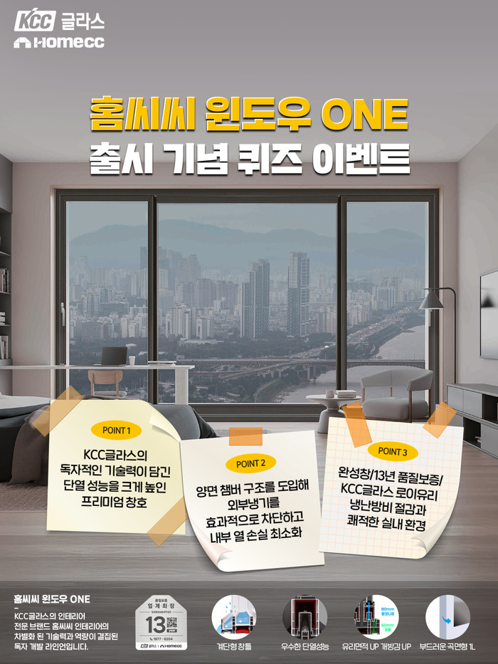 KCC글라스 홈씨씨 인테리어는 홈씨씨 윈도우 ONE 출시를 기념해 이달 25일까지 공식 인스타그램에서 퀴즈 이벤트를 진행한다. 이벤트 게시물에 ‘좋아요’를 누르고 저장한 후 홈씨씨 인테리어가 새롭게 출시한 창호의 제품명을 댓글로 남기면 참여가 완료된다.